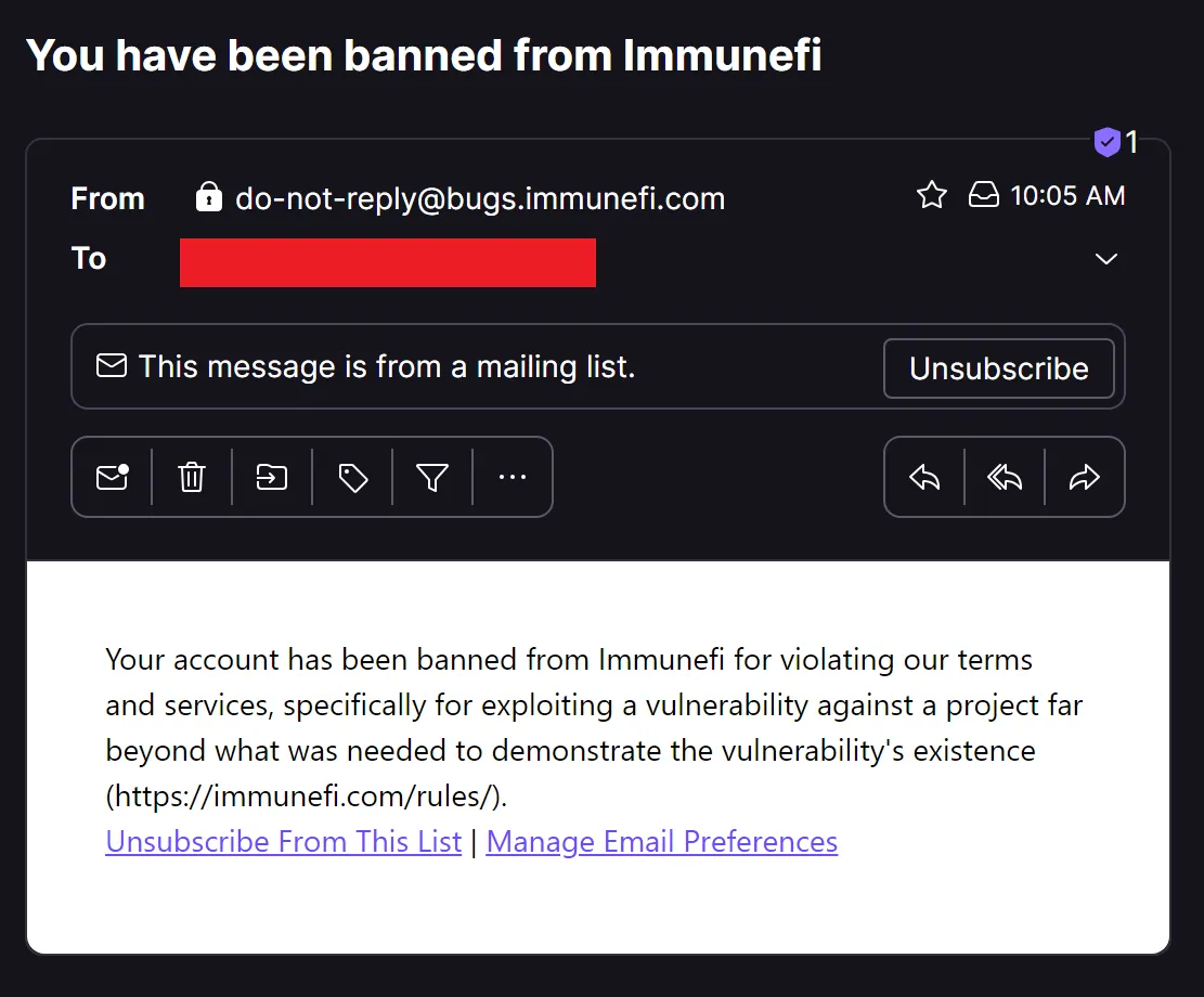 - January 16th, 2024- Received an email saying that I had been banned from Immunefi for “for exploiting a vulnerability against a project far beyond what was needed to demonstrate the vulnerability’s existence”.
