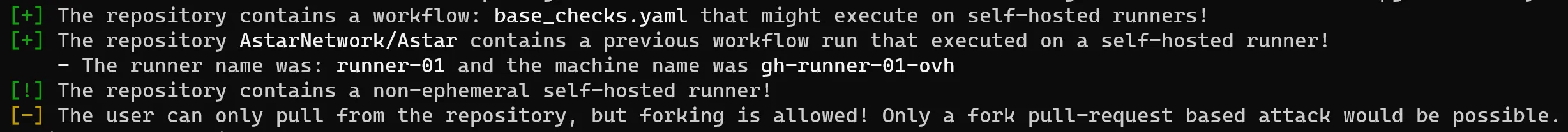 Armed with Gato, a tool purpose built for finding GitHub CI/CD vulnerabilities, I simply had to run it on the Astar organization to discover the non-ephemeral self-hosted runner attached to the Astar repository.