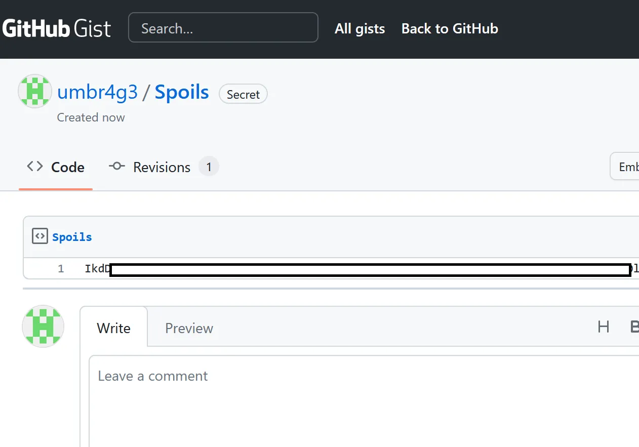 Shortly after, I received the secrets in the form of a Gist.